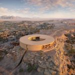 From afar, the building appears almost like a polished rock emerging from the valley; up close, its monolithic circular form reveals itself — a structure conceived to feel as though it has always belonged to the land.