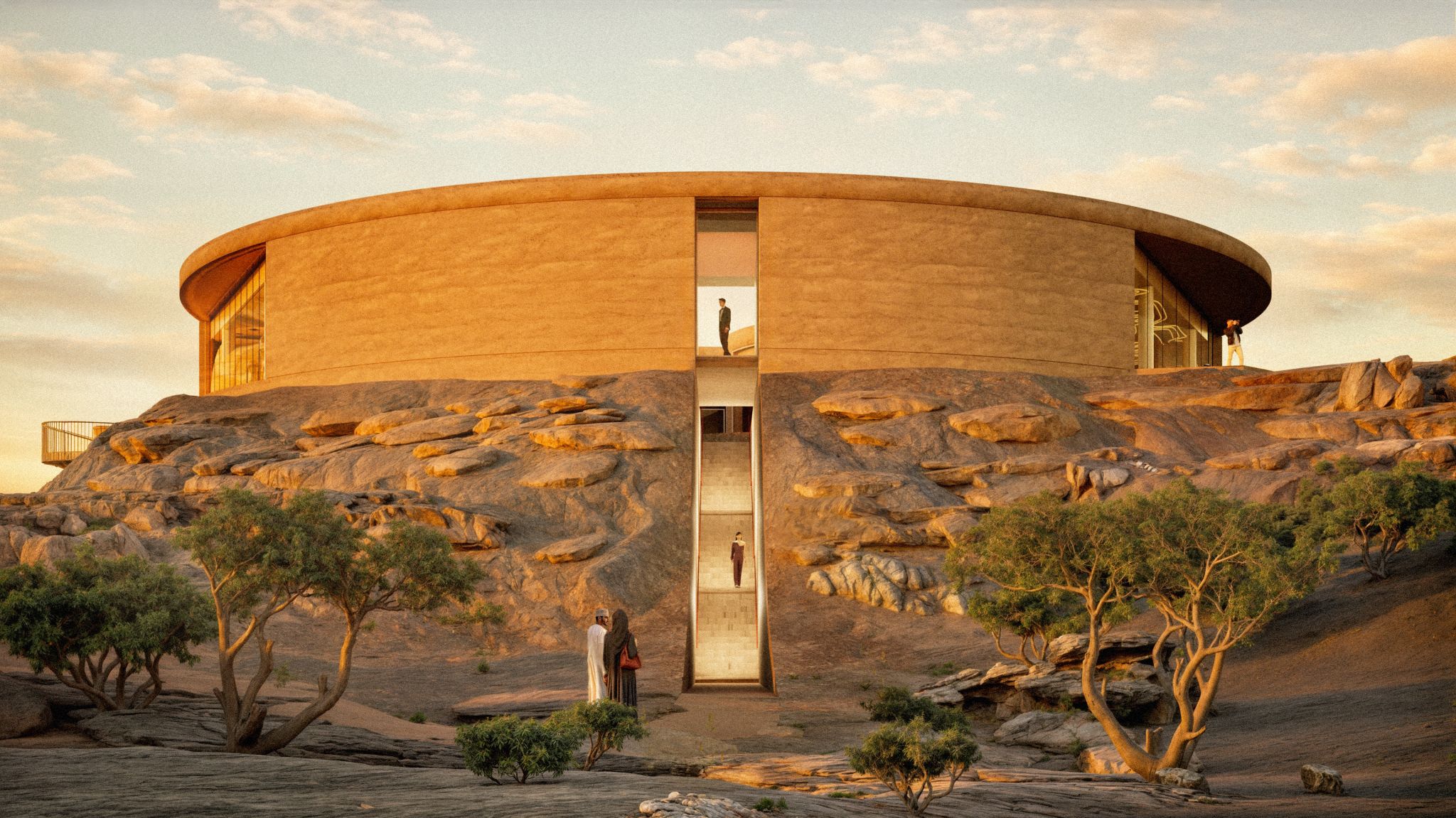 Designed by Giò Forma Studio (Milan) and F&M Middle East Engineering Consultancy (Oman), its rammed-earth textures, dry stone, and burnished tones echo the Dhofari landscape, enclosing a central frankincense garden and framing the wadi through sculpted sightlines. A modern landmark rooted in ancient terrain.