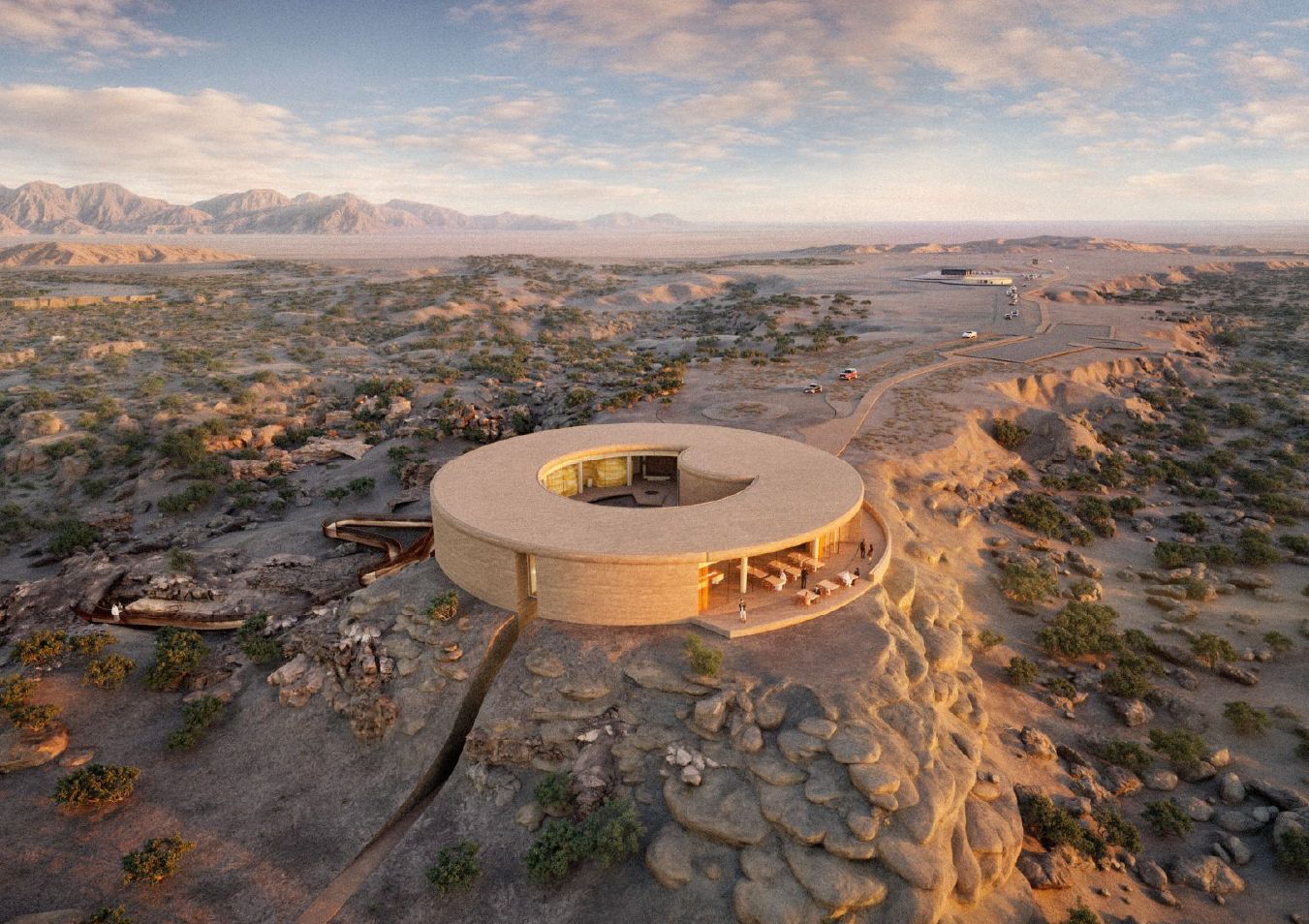 From afar, the building appears almost like a polished rock emerging from the valley; up close, its monolithic circular form reveals itself — a structure conceived to feel as though it has always belonged to the land.