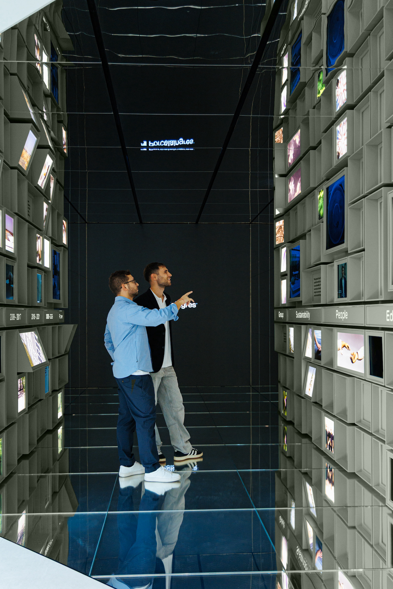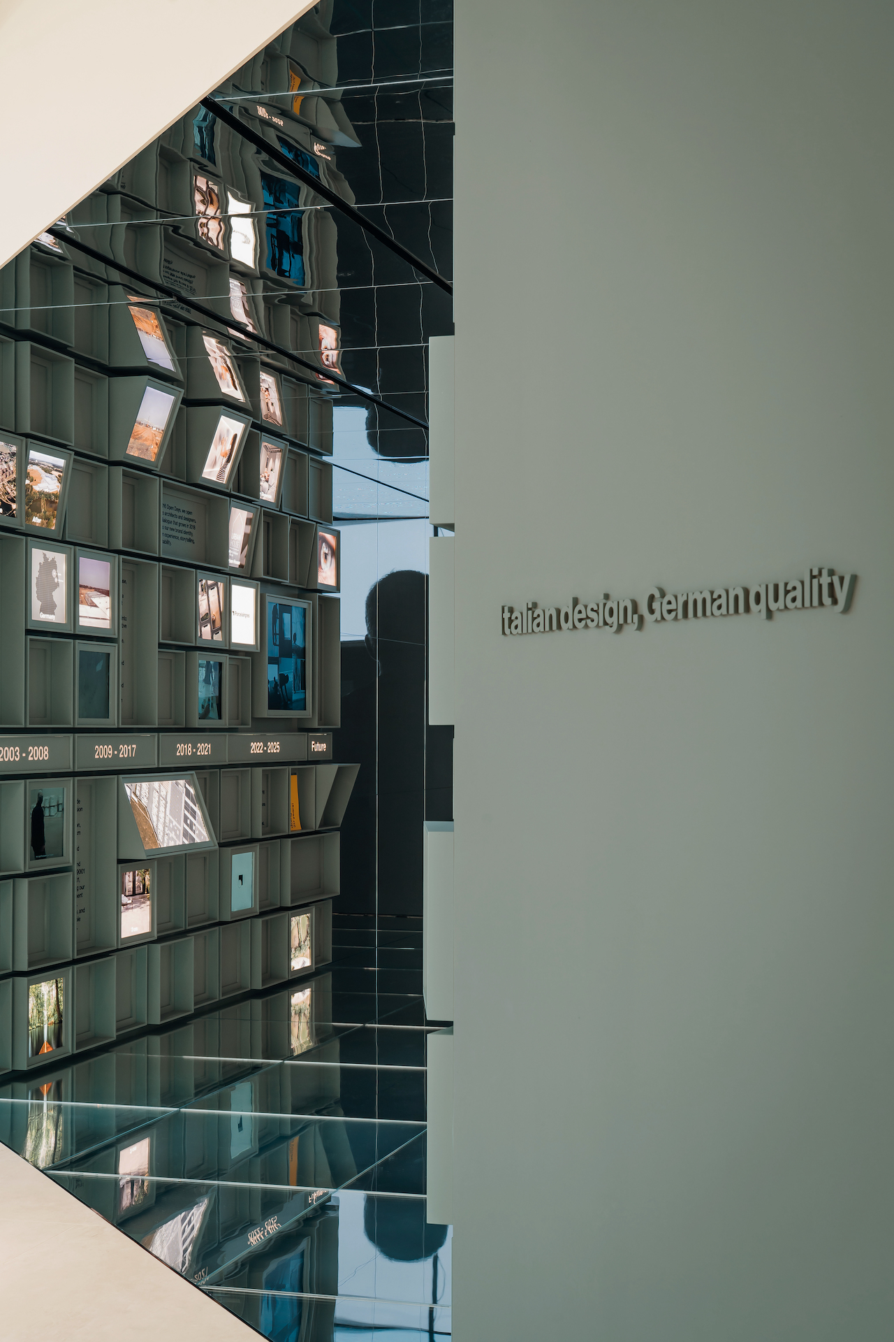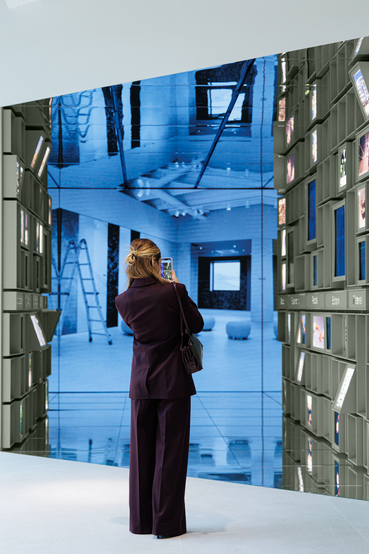 The journey leads to a full-height LED wall: the visual climax. The video of the showroom renovation expands across reflective surfaces that multiply perspectives, turning the space into an immersive, almost cinematic experience.