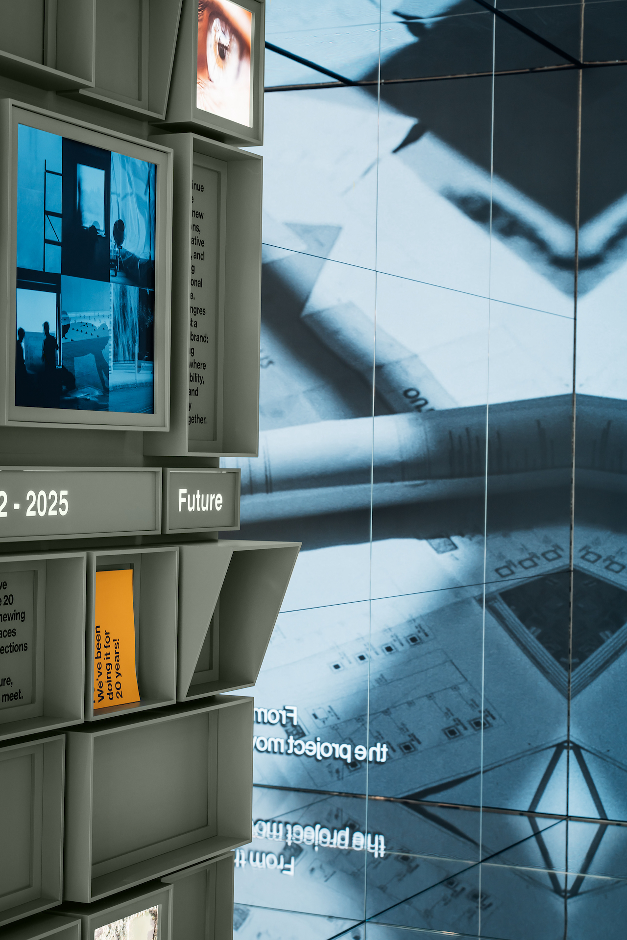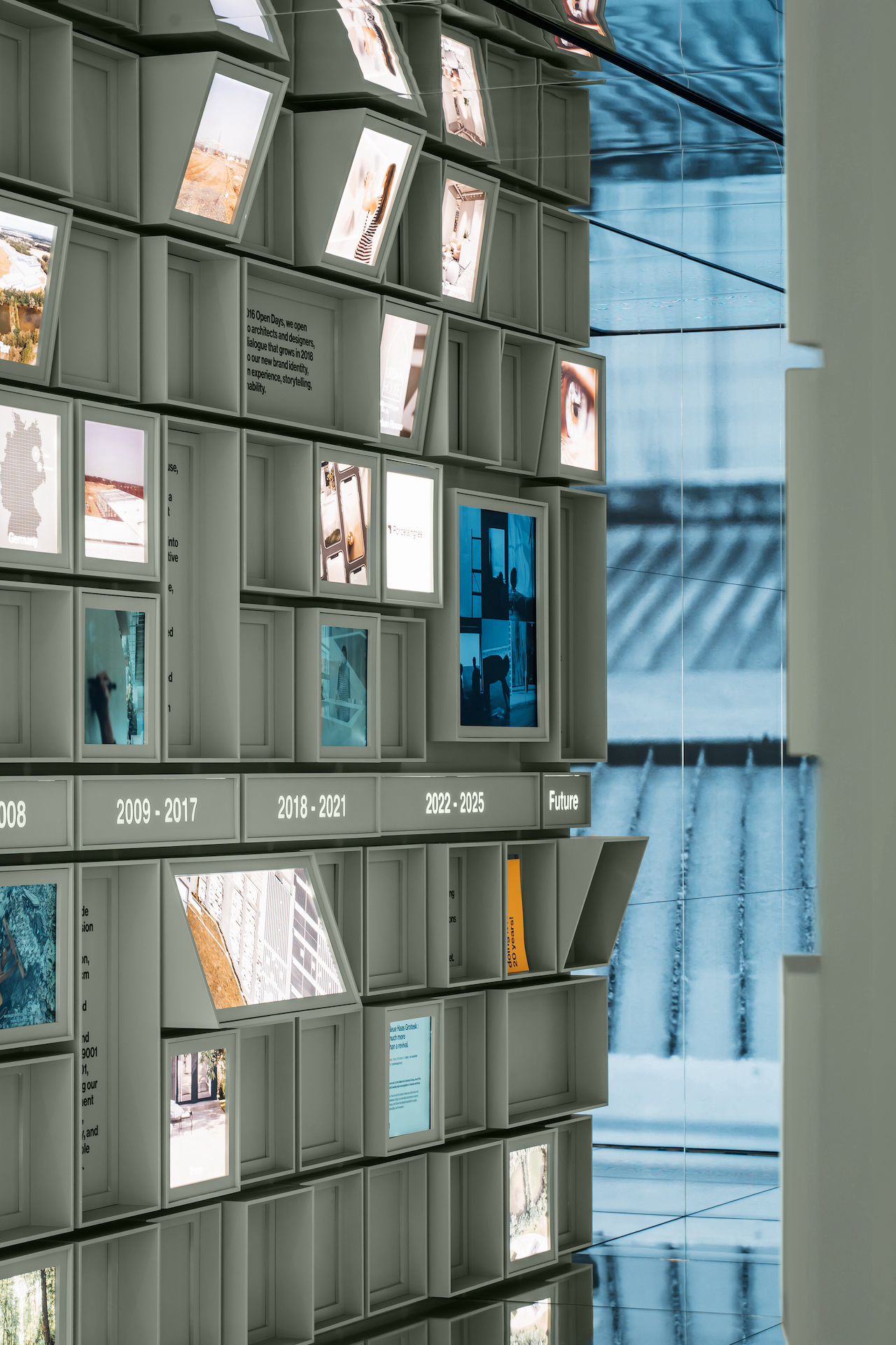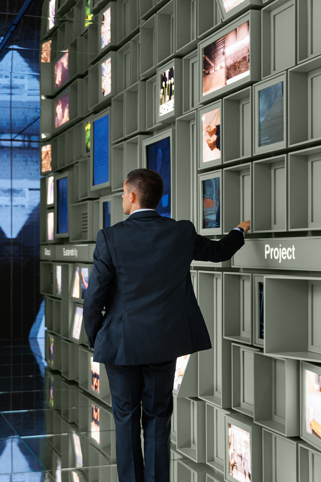 The journey leads to a full-height LED wall: the visual climax. The video of the showroom renovation expands across reflective surfaces that multiply perspectives, turning the space into an immersive, almost cinematic experience.