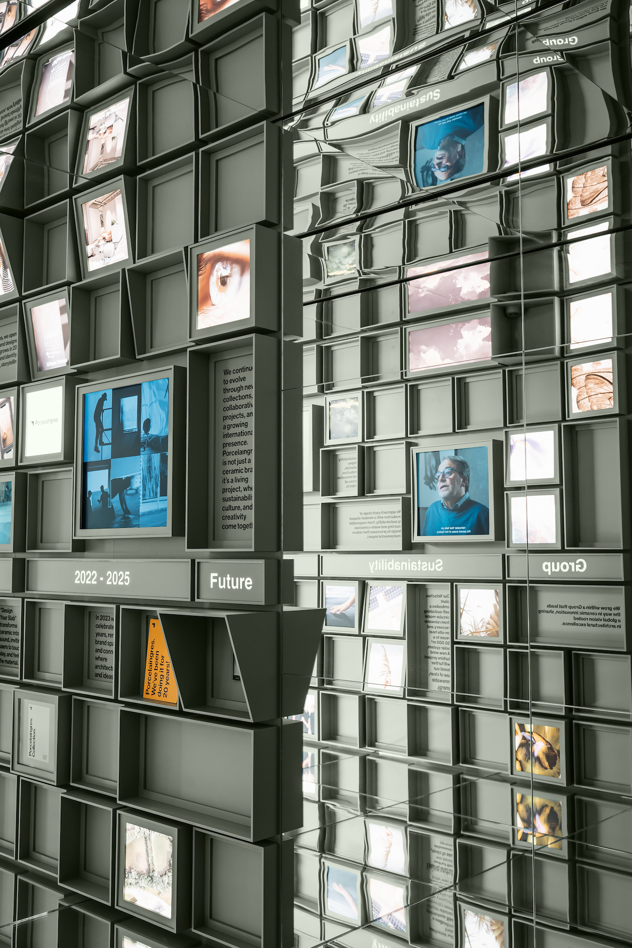 On the left, an interactive timeline connects Porcelaingres’ history with global design milestones, a reminder that the brand has always looked outward, always stayed curious.