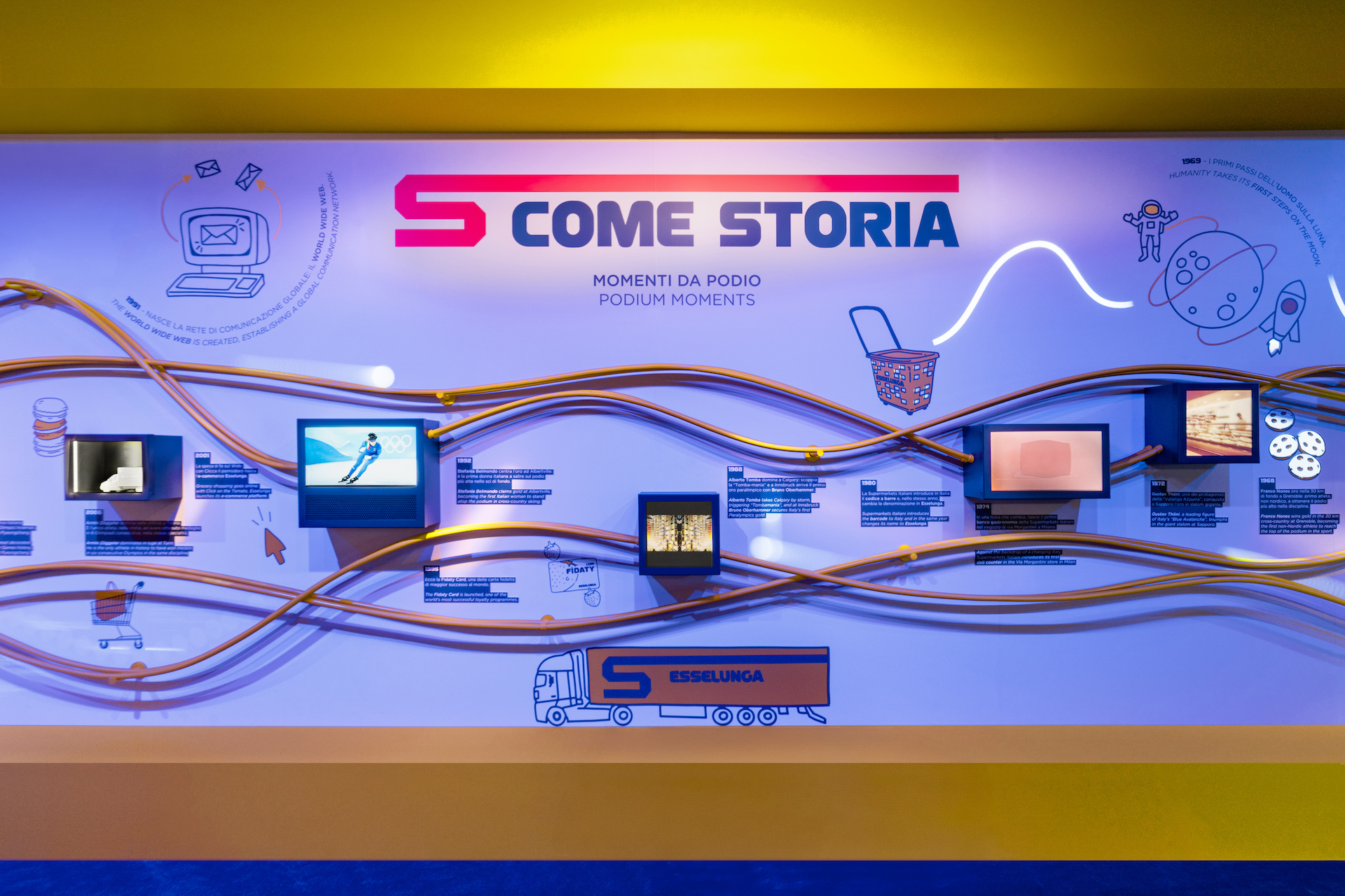Through “La Grande Discesa,” visitors access the lower level: not just a staircase, but a tribute to the value of people, welcomed by the energy of the crowd like true athletes. The journey continues with curiosities about Olympic and Paralympic disciplines along the “Numerabilia” wall, with the “Sports Locker”—which transforms the online grocery locker into an interactive feature—and with “S come Storia,” a multimedia timeline recounting, in parallel, the most significant moments of Italian sport at the Olympics and key milestones in Esselunga’s history.