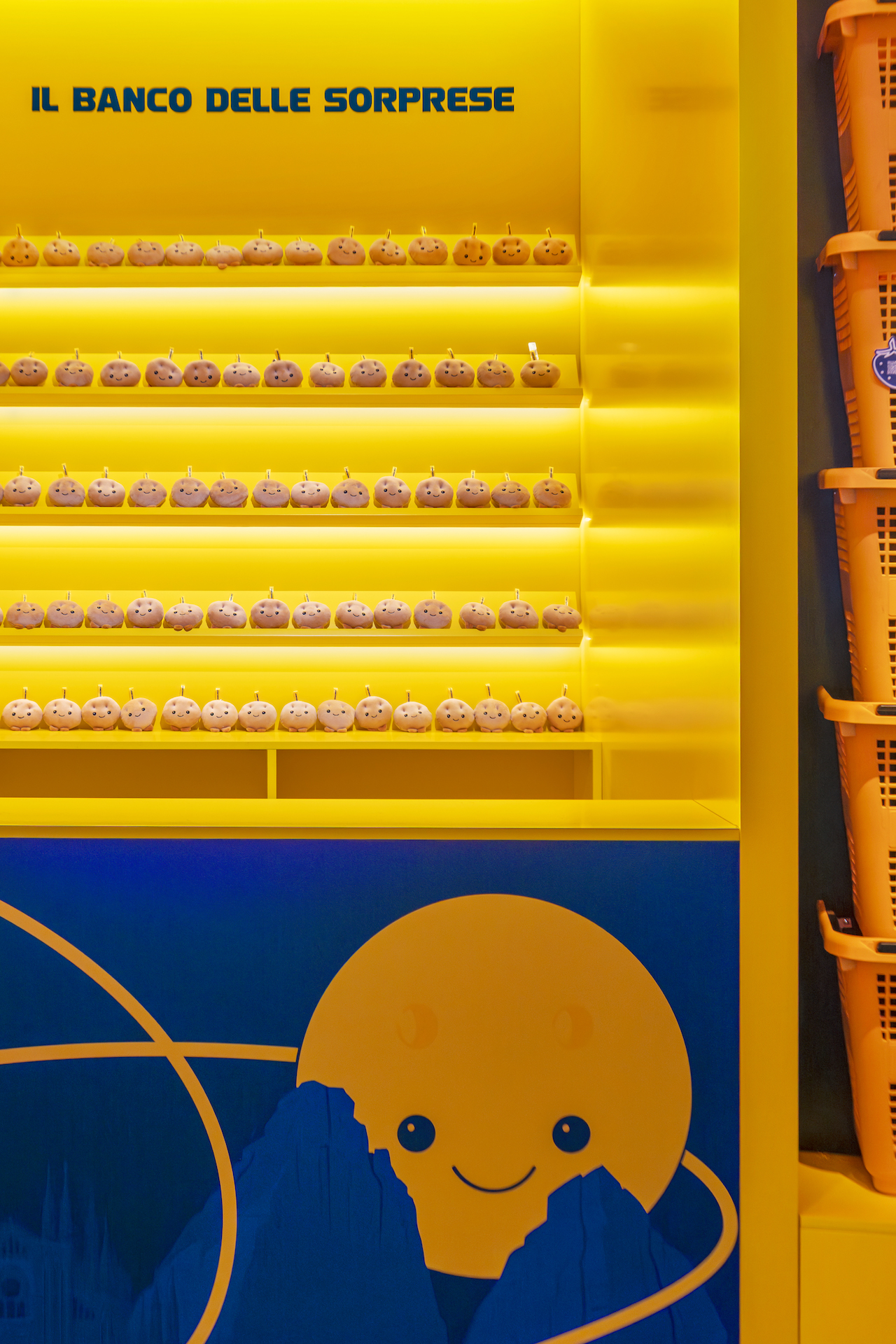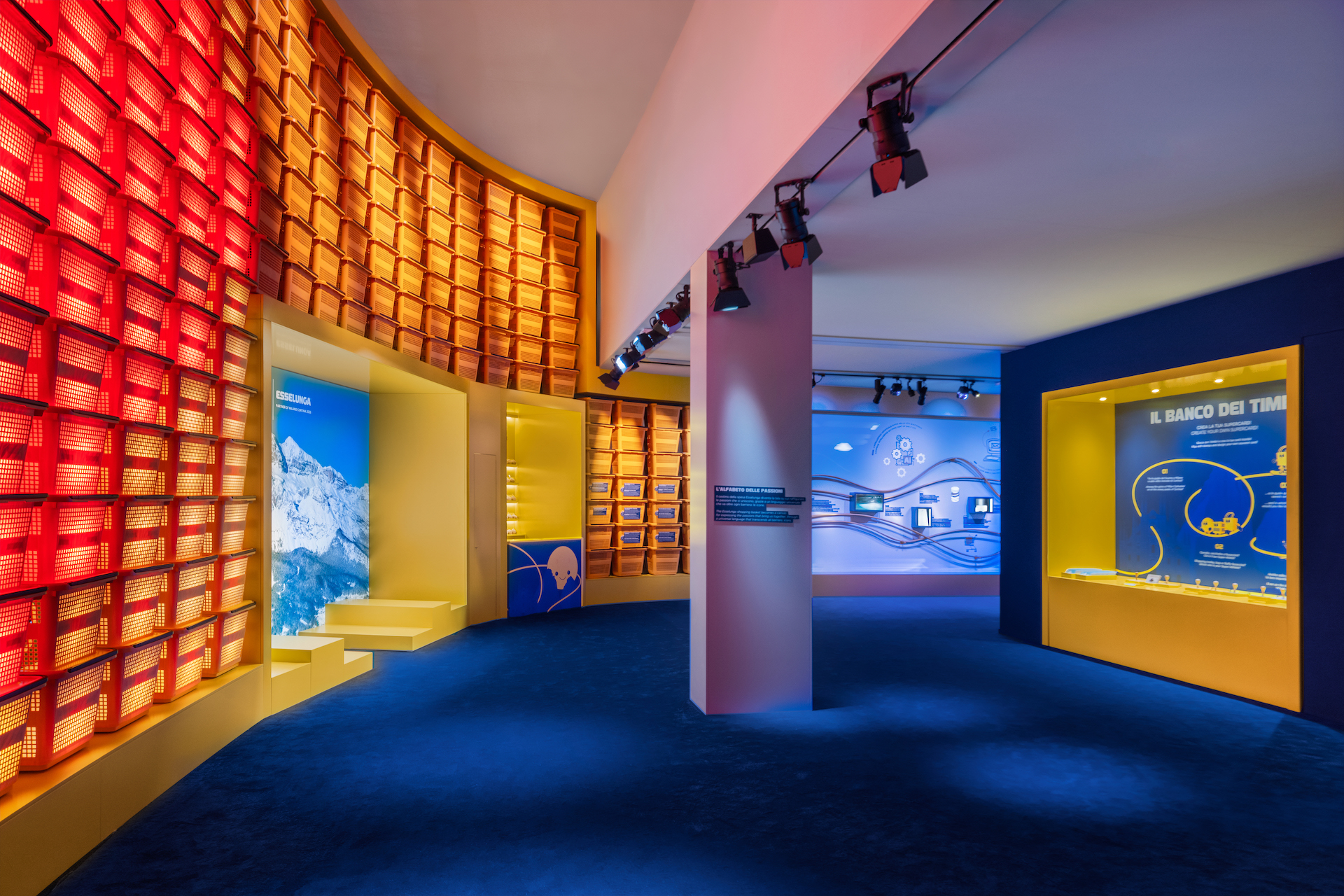 The journey concludes with “L’Alfabeto delle Passioni,” a wall of illuminated baskets that form symbols and icons, and with “Il Super Training,” an immersive game inspired by curling that invites visitors to step onto the rink for friendly competition. Outside Casa Esselunga, a mascot welcomes and entertains visitors.