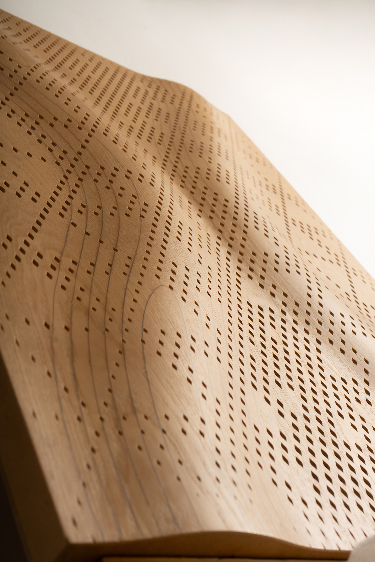 The collaboration with Strong by Form enabled the application of the Woodflow-skin technology, an innovative high-performance composite wood panel system shaped into fluid, organic forms.