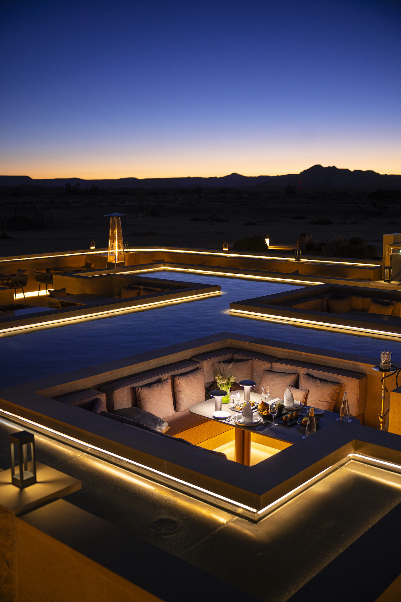 As night falls over AlUla, Sky View glows softly above the desert — an evening shaped by light, stillness, and the quiet pleasure of dining under an endless sky.